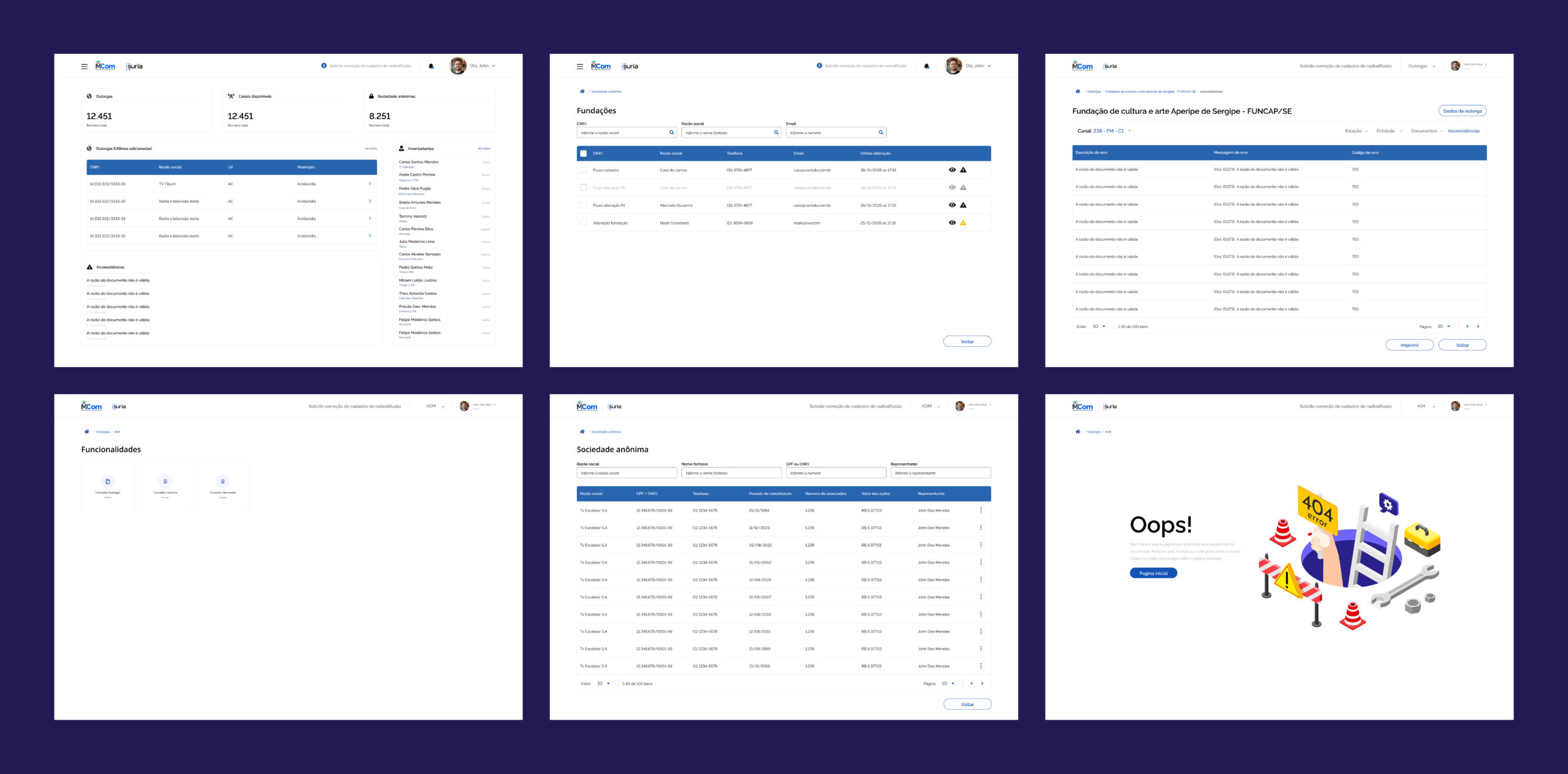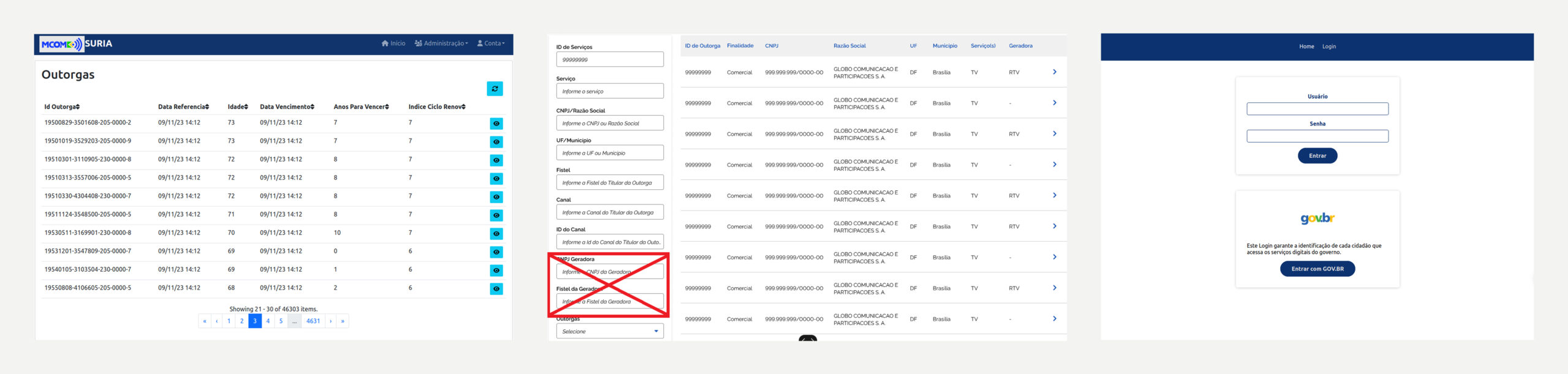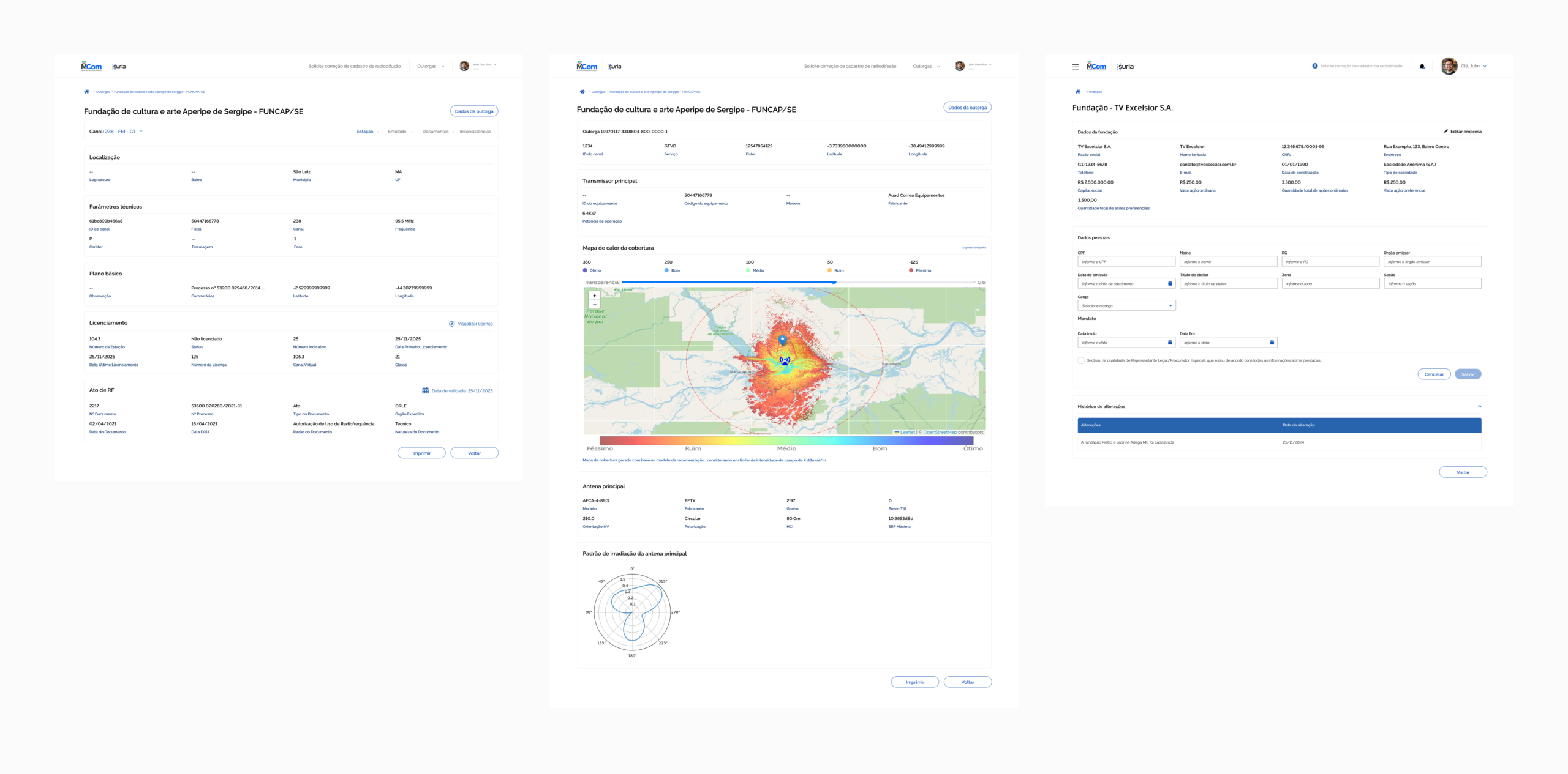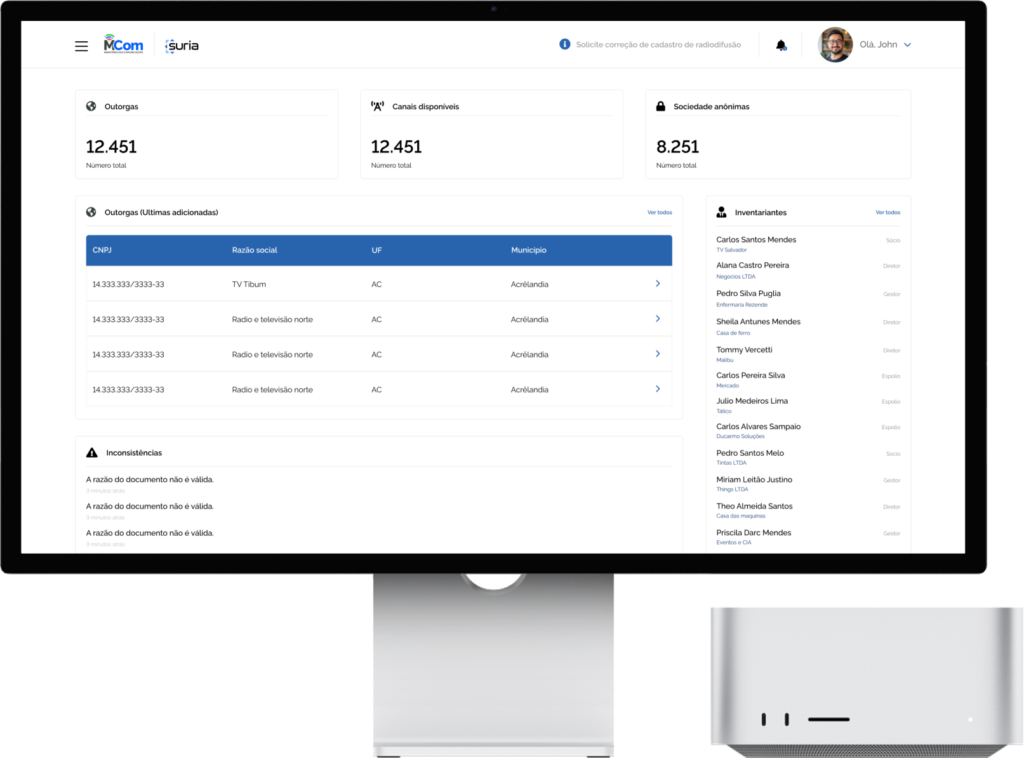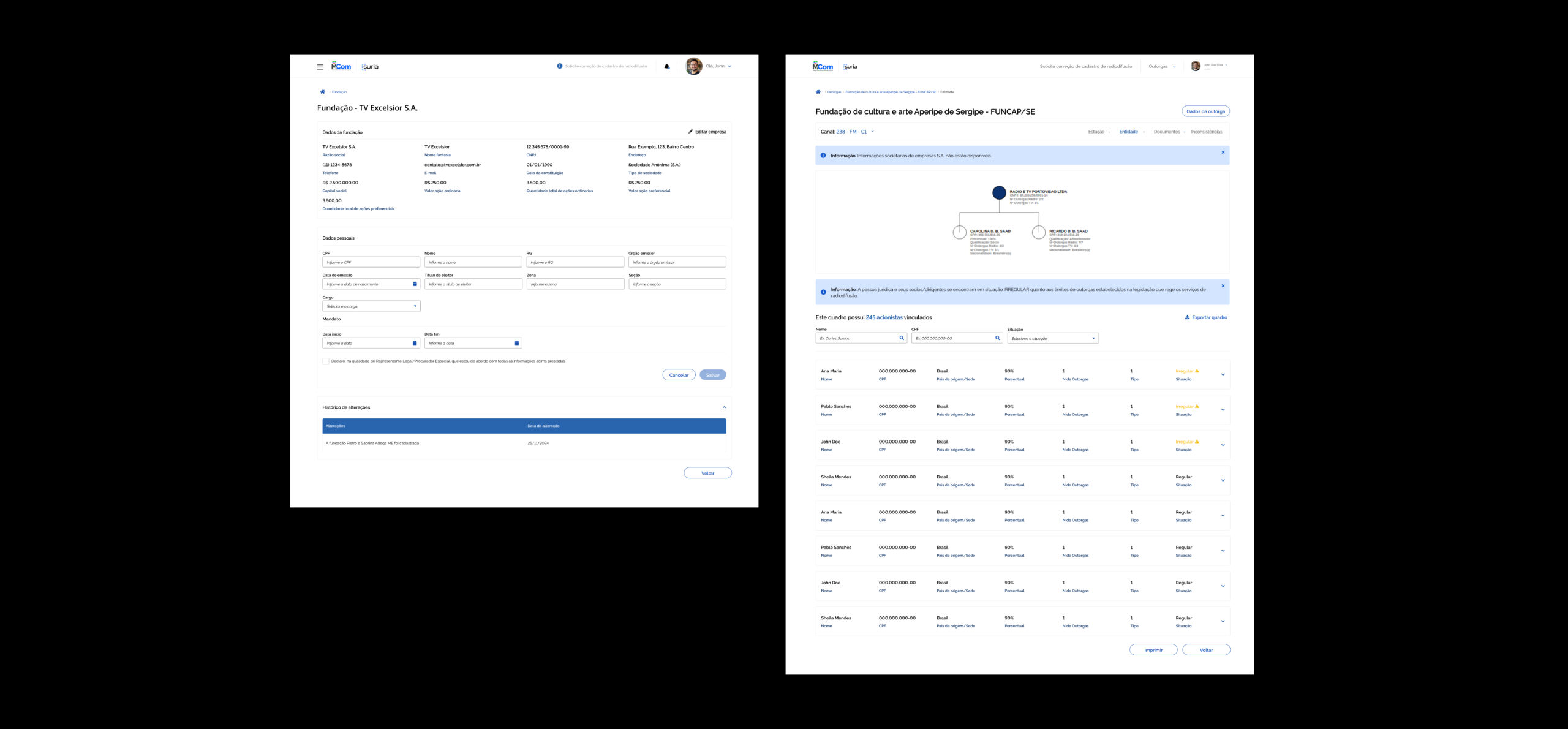 No setor de radiodifusão, entender ‘quem é quem’ por trás de uma concessão é uma tarefa crítica. Para o Suria, desenhei um módulo de gestão de entidades que descomplica estruturas societárias densas. O desafio aqui foi criar uma tabela que suportasse centenas de acionistas sem perder a legibilidade, integrando indicadores de regularidade fiscal e jurídica diretamente na listagem.